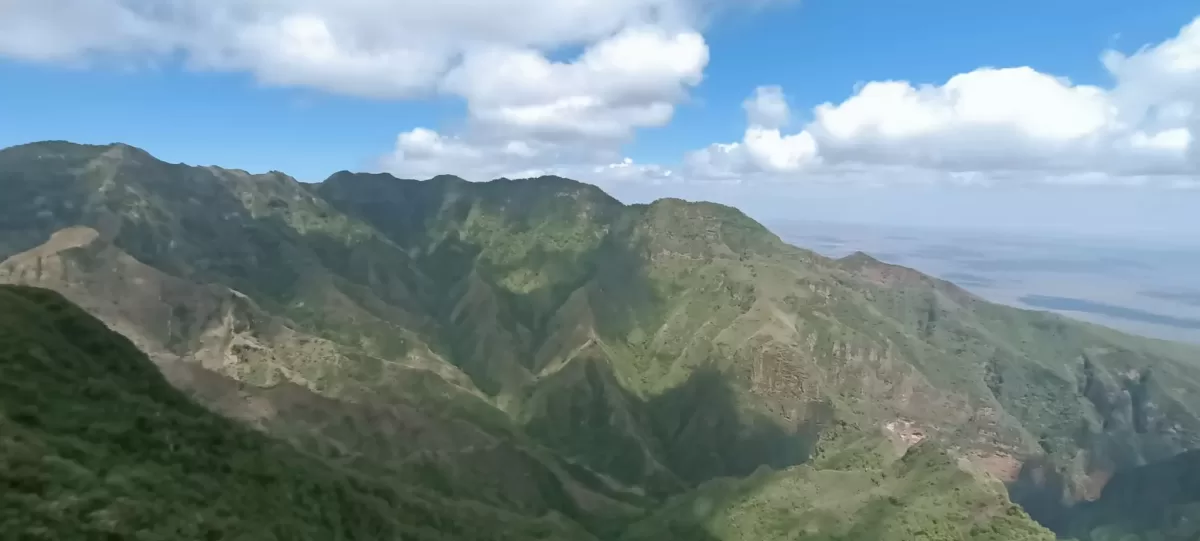 This peak is one of the remains of a volcanic crater located at the centre of the mountain ridge. But the eastern rim has been eroded over millennia to form the magnificent El Kajarta Gorge, which splits Kulal into two parts. The lower slopes give way to alluvial plains at 500 to 700 m. To the south, these plains are bounded by the even higher mountain ranges of the Ndoto and Nyiru (2 752 m).
